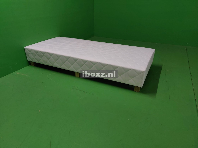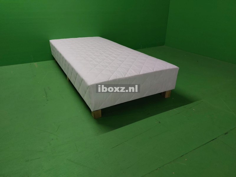 De 1-persoons bonell geveerde box is voorzien van 6 rechthoekige blank pootjes.