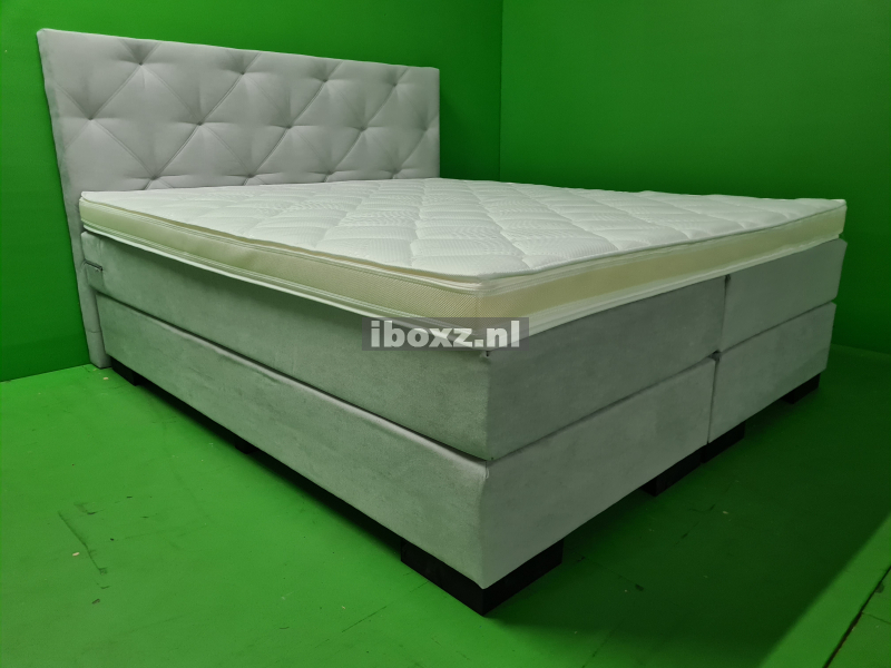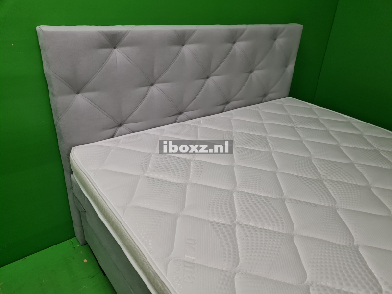 Boxspring HAMPSHIRE compleet met 7-zone pocketveermatrassen, 10 cm. dikke HR 55 topdek matras en hoofdbord.