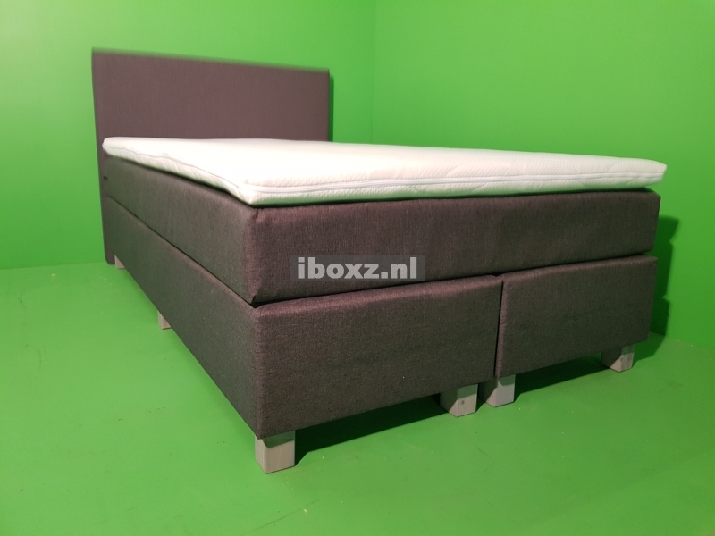 # Deze prima liggende twijfelaar boxspring bestaat uit 2 bonell geveerde boxen 60 x 200 met elk 6 grijs gebeitste pootjes.
